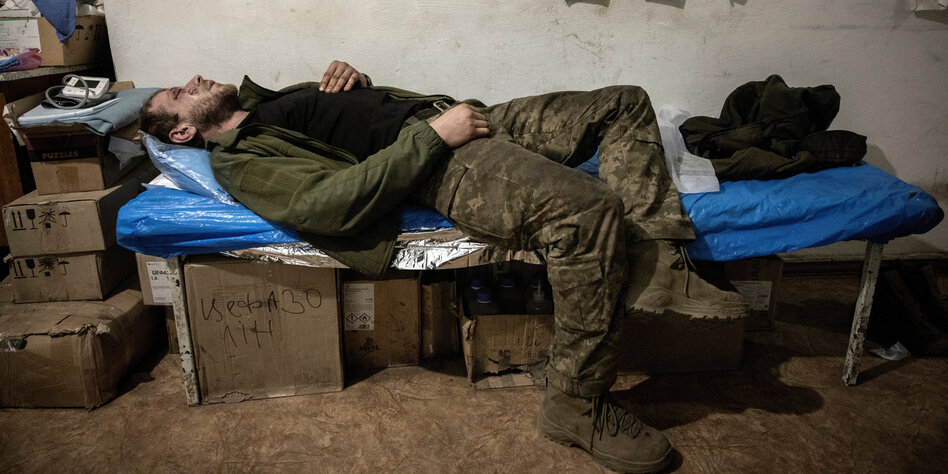 IMG Bild: Vom Krieg gezeichnet: Ein verletzter Soldat an der Front in der Region Donezk am 15. April