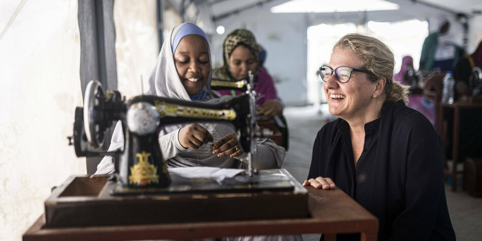 IMG Bild: „Was wir hier machen, ist wichtig“: Svenja Schulze mit einer Näherin in einem Unicef-Projekt