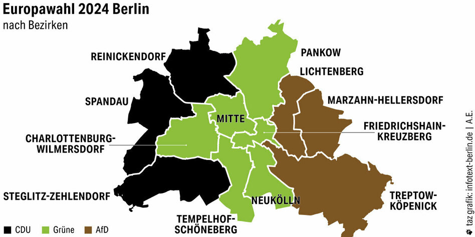 IMG Bild: Die Grünen als dominierende Kraft in der Mitte, während im Westen Berlins die CDU dominiert und im Osten die AfD