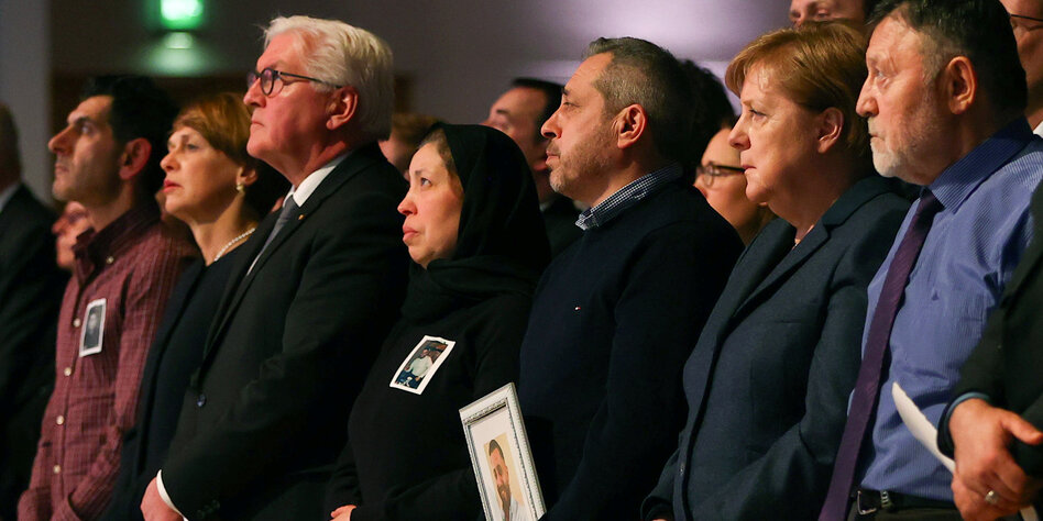 IMG Bild: Angehörige der Opfer stehen bei der Gedenkfeier neben Kanzlerin Merkel und Bundespräsident Steinmeier