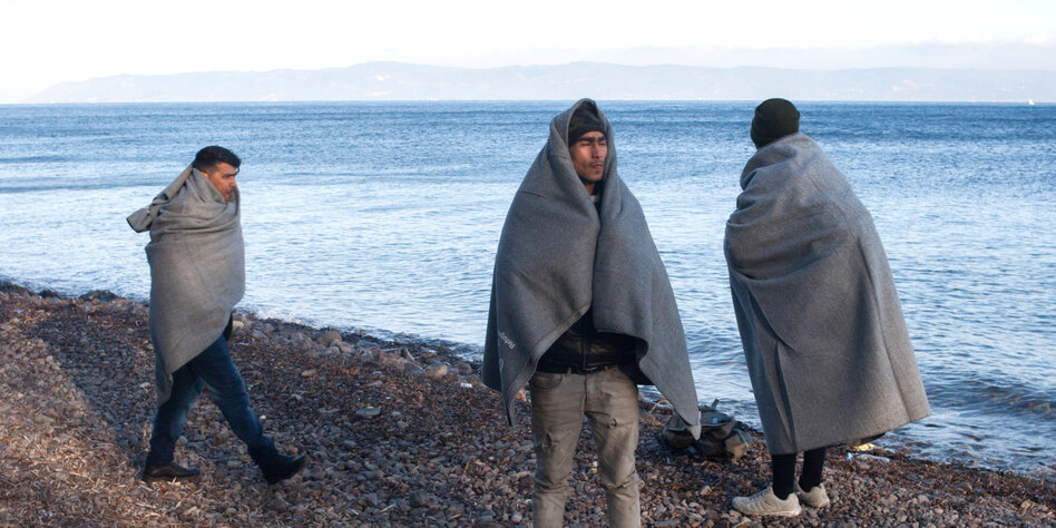 IMG Bild: Drei Geflüchtete an einem Strand von Lesbos am 2. März