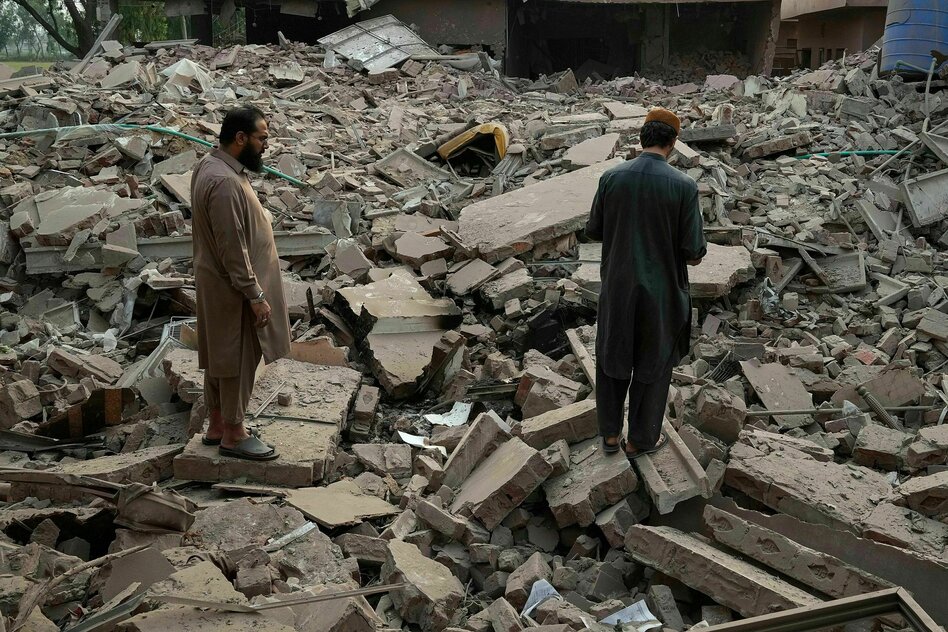 IMG Bild: Die Trümmer eines zerstörten Gebäudes nach einem indischen Raketenangriff in Muridke, 7. Mai