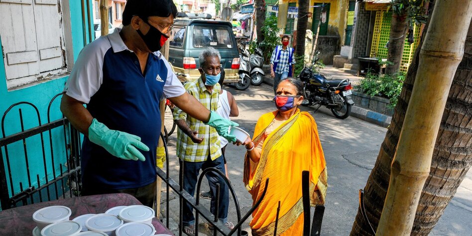 IMG Bild: Ein Sozialarbeiter in Kalkutta verteilt während der Ausgangssperre Mahlzeiten
