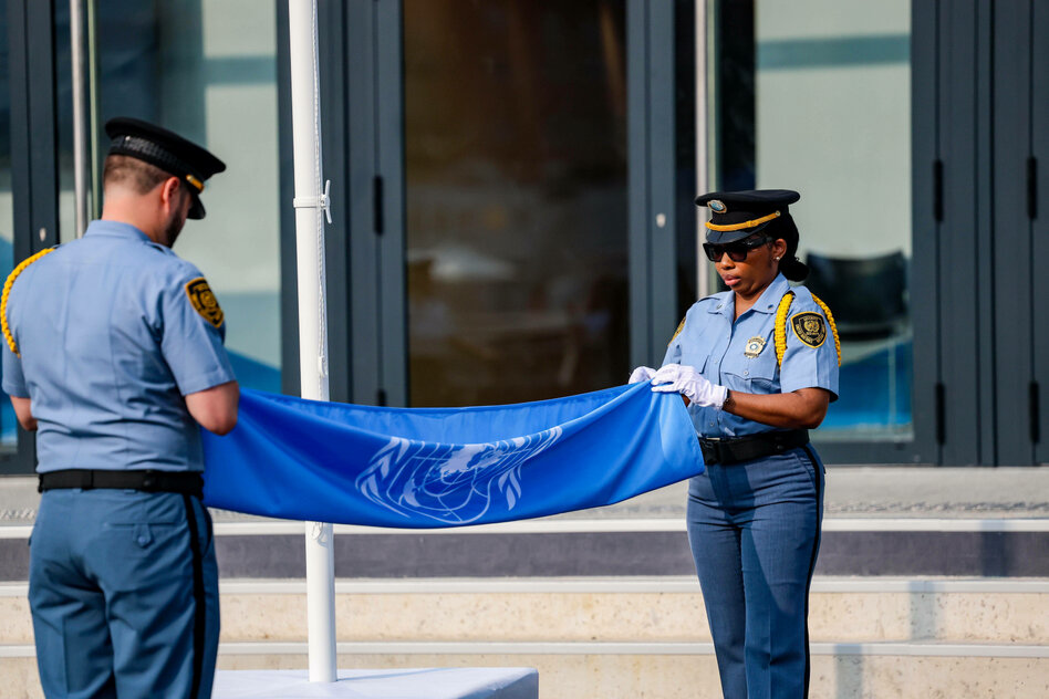 IMG Bild: Kann das Völkerrecht einpaken? Zwei UN-Mitarbeitende falten die Flagge der Vereinten Nationen zusammen