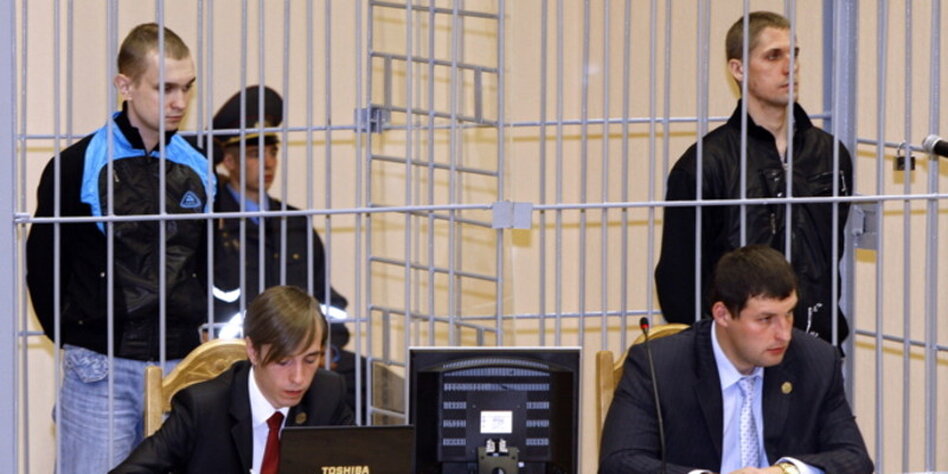 IMG Bild: Zum Tode verurteilt: Dmitri Konowalow (l) und Wladislaw Kowalew im Gerichtssaal in Minsk.