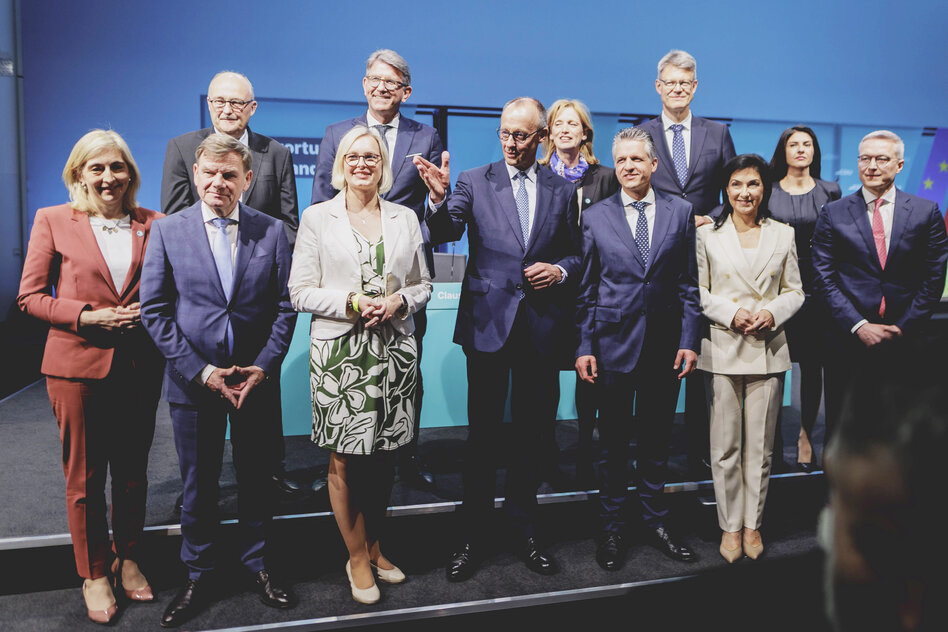 IMG Bild: Friedrich Merz mit seinen designierten Minister:innen am Montag in Berlin