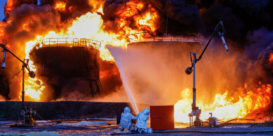 IMG Bild: Feuerwehrleute löschen ein brennendes Öllager in Shakhtarsk