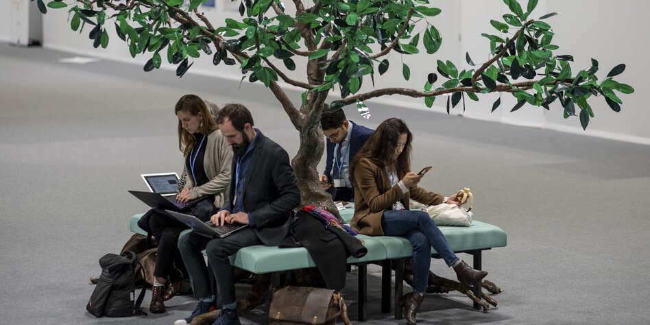 IMG Bild: Besucher der COP sitzen an einem unechten Baum