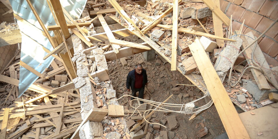IMG Bild: Aserbaidschan, Tartar: Ein Mann steht in den Trümmern seines Hauses