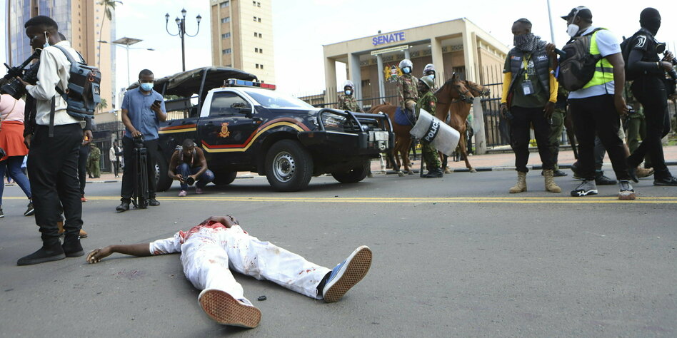 IMG Bild: Mit einem Kopfschuss getötet: Demonstrant vor dem Kenianischen Parlament am 25. Juni