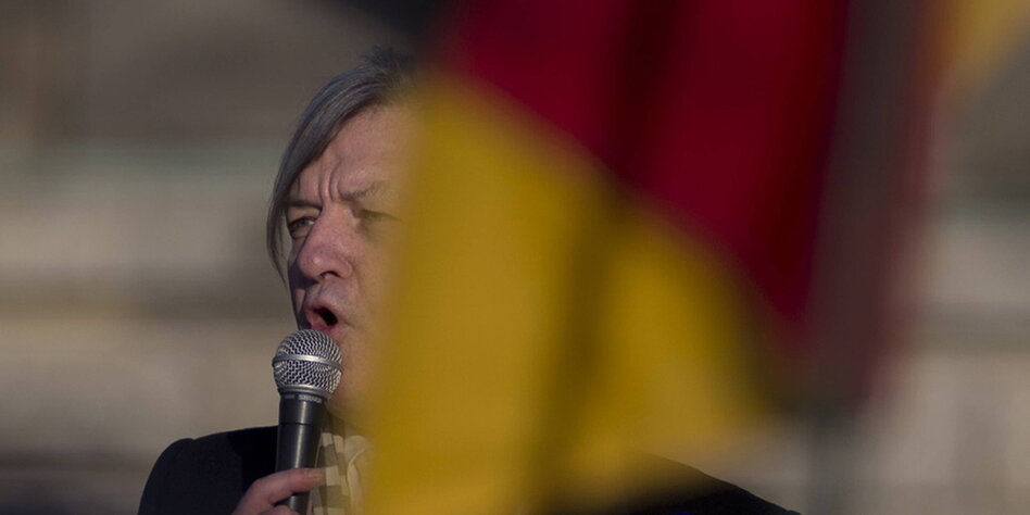 IMG Bild: War auch dabei: Jürgen Elsässer – hier leicht verdeckt hinter seiner Lieblingsflagge, der deutschen