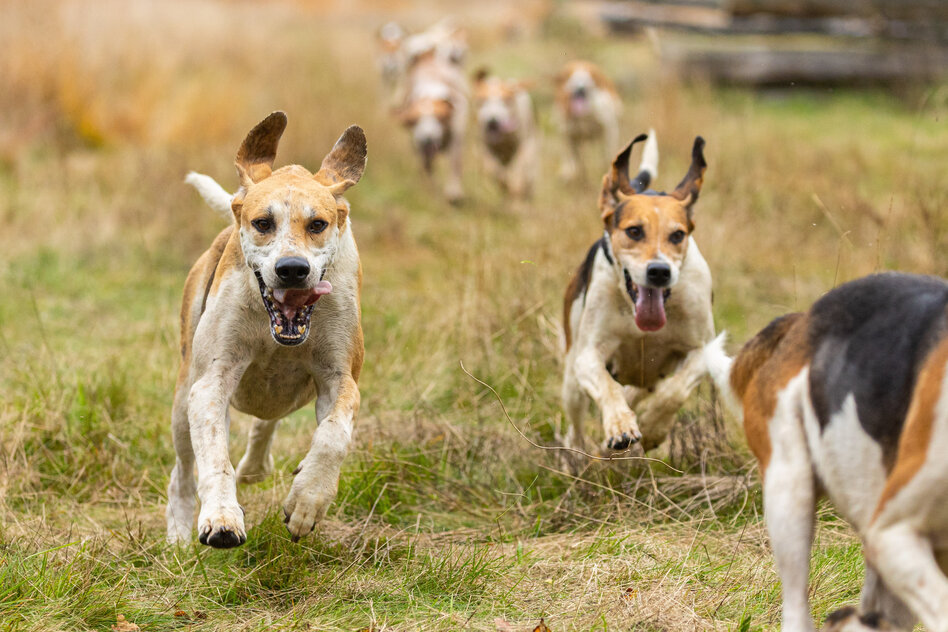 IMG Bild: Bei der Hubertusjagd folgt die Meute der künstlichen Fährte: Beim Training will die Jägerschaft Hunde auf lebende Tiere hetzen