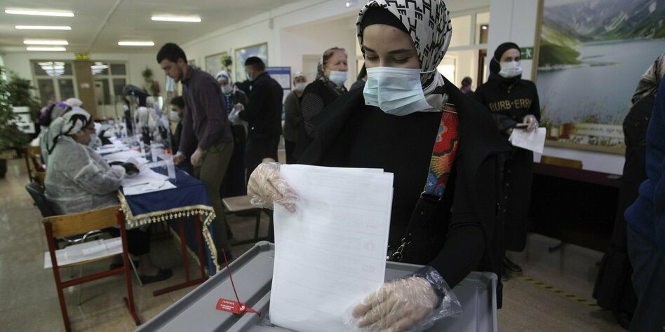 IMG Bild: Stimmenabgabe in Grosny, Tschetschenien: Angeblich liegt die Wahlbeteiligung bei 70 Prozent