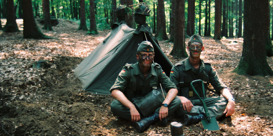 IMG Bild: Jost Maurin (links) mit einem anderen Wehrpflichtigen bei einer Übung in einem Wald im Sommer 1994