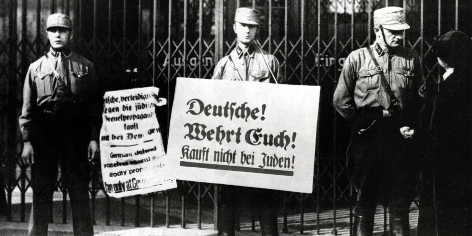IMG Bild: Judenanfeindungen vor den Novemberpogromen: Am 1. April 1933 ruft die SA in Berlin zum Boykott jüdischer Einrichtungen auf