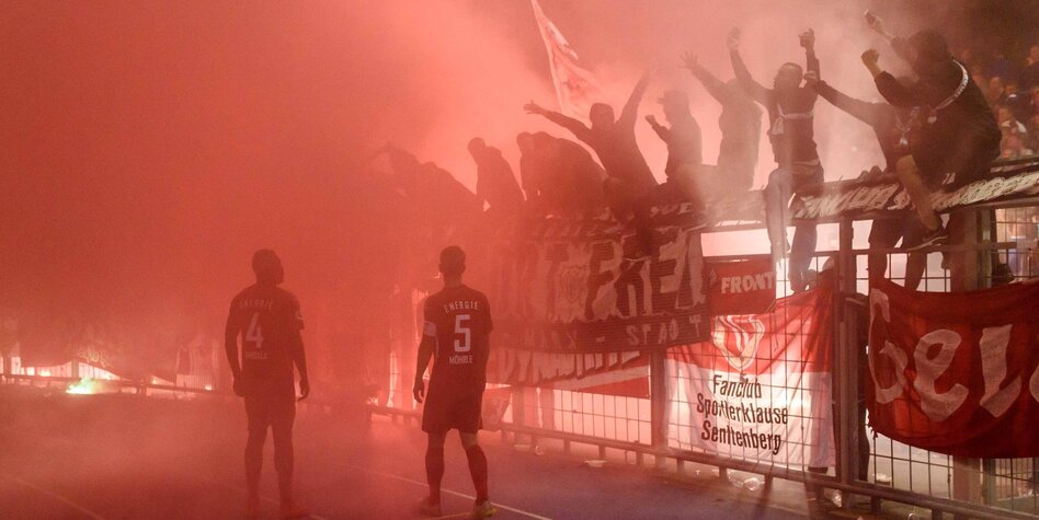 gezündet worden war und zehn Cottbuser Fans auf den Fußballplatz stürmten.