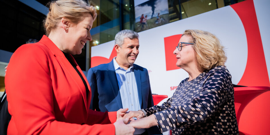 IMG Bild: Händchen halten und Mut machen: Franziska Giffey und Raed Saleh mit Entwicklungsministerin Svenja Schulze (v.l.n.r.)