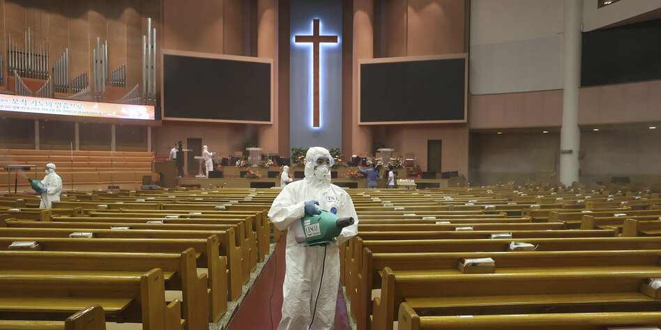 IMG Bild: Gesundheitsbeamte desinfizieren am Dienstag, 18. August, die Bankreihen einer Kirche in Yoido, Seoul