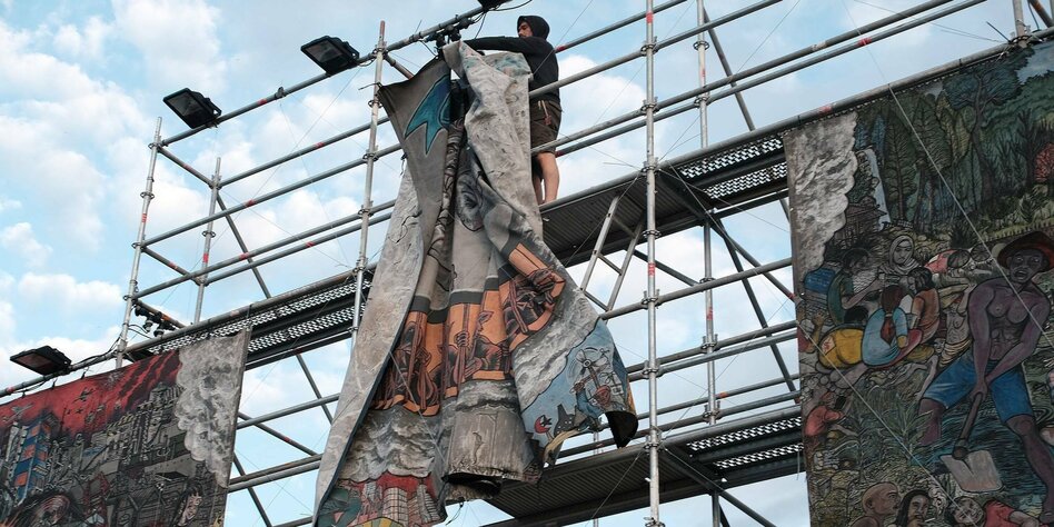 IMG Bild: Wegen antisemitischer Darstellungen wurde das Banner „People's Justice“ auf der documenta fifteen abgehängt