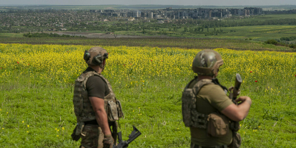 IMG Bild: Ukrainische Soldaten schauen auf die Stadt Bachmut