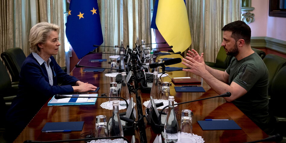IMG Bild: Im Dialog über den Beitritt der Ukraine in die EU: Komissionschefin von der Leyen und Selenski