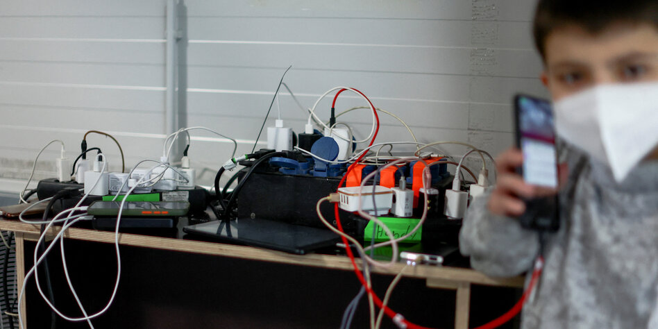 mit Laptops. Davor sitzen Menschen in „Zivil“, vermutlich Ukrainer*innen,
