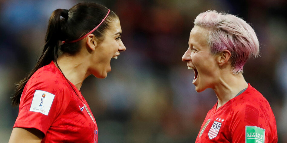 IMG Bild: Gut drauf: Alex Morgan (l.) freut sich mit Megan Rapinoe über das Torfestival