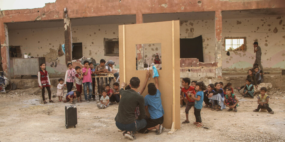 IMG Bild: Zeichen der Hoffnung in einem zerstörten Land: Puppenspieler vor einer Schule in Syrien