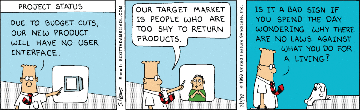 Dilbert comes home carrying his brief case. He says to Dogbert, "Is it