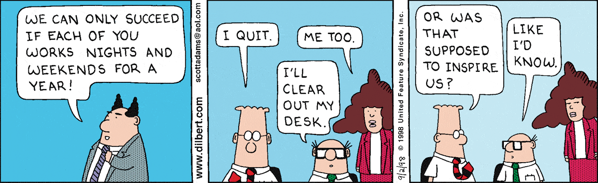 weekends for a year!" Dilbert says, "I quit." Wally says, "I'll
