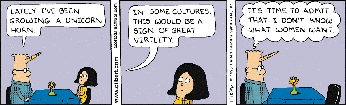 Dilbert is on a dinner date. Dilbert has a unicorn horn growing from