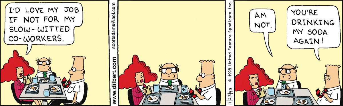 says, "Am not." Dilbert turn to Wally and says, "You're drinking my