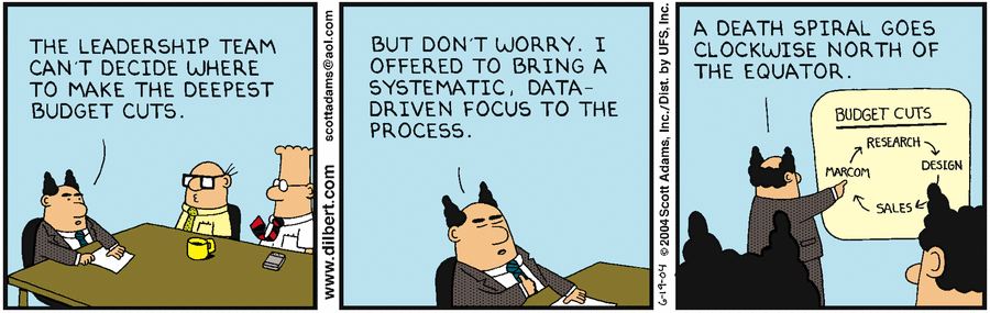 north of the equator." "Budget cuts" "Research" "Design" "Sales"