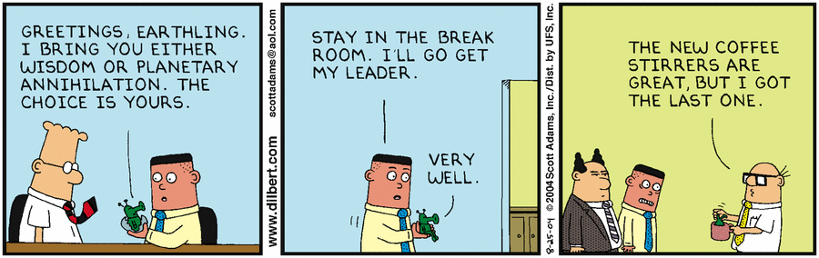 go get my leader." "Very well." "The new coffee stirrers are great,