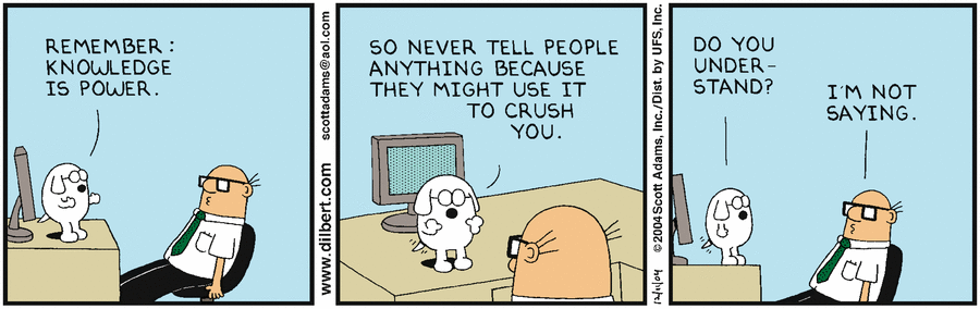Dilbert - 2004-12-11 - DIR Previous DIR Next IMG 2004-12-11 Remember: Knowledge is power. "So never tell people anything because they might use it to crush you." "Do you understand?" "I'm not saying." Tags :