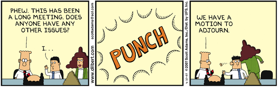 Dilbert - 2007-04-23 - DIR Previous DIR Next IMG 2007-04-23 Phew. This has been a long meeting. Does anyone have any other issues? "I..." PUNCH "We have a motion to adjourn." Tags :
