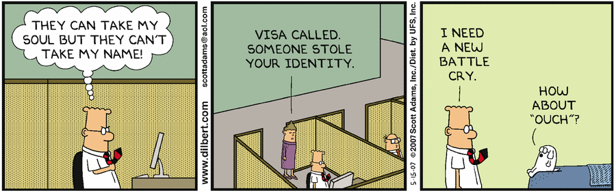 Dilbert - 2007-05-15 - DIR Previous DIR Next IMG 2007-05-15 They can take my soul but they can't take my name! "Visa called. Someone stole your identity." "I need a new battle cry." "How about 'ouch'?" Tags :