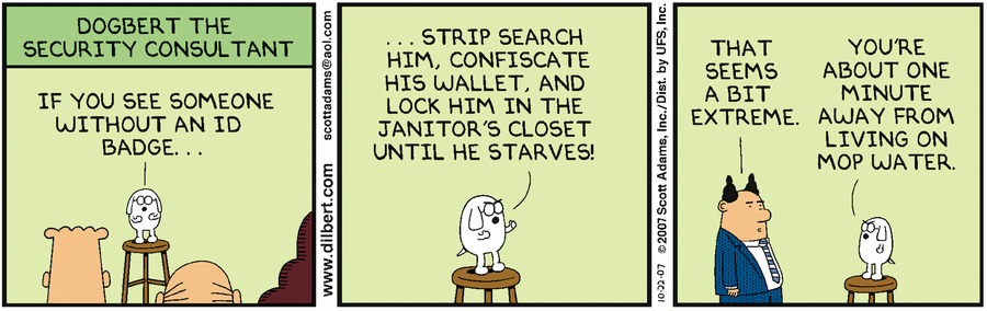 Dogbert the security consultant "If you see someone without an ID