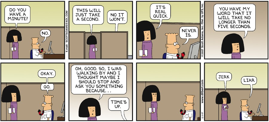 "Do you have a minute?" "No." "This will just take a second." "No it