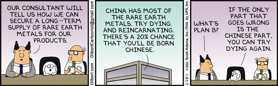 Boss says, "What's plan B?" Dogbert says, "If the only part that goes
