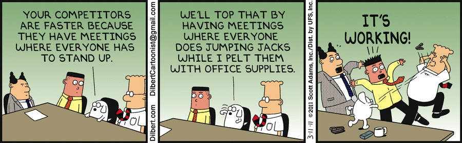where everyone has to stand up." Dogbert says, "We'll top that by