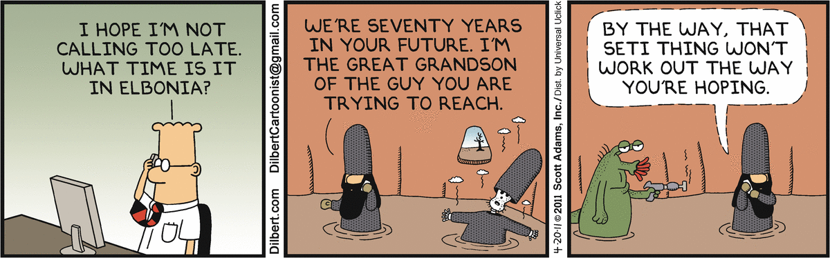 Dilbert: I hope I'm not calling too late. What time is it in Elbonia?