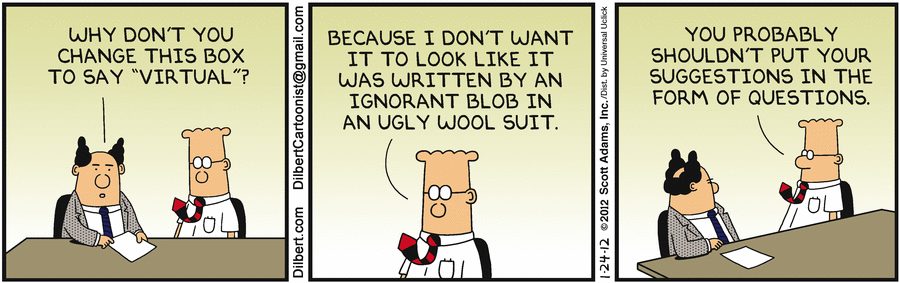 Boss: Why don't you change this box to say "virtual"? Dilbert: Because