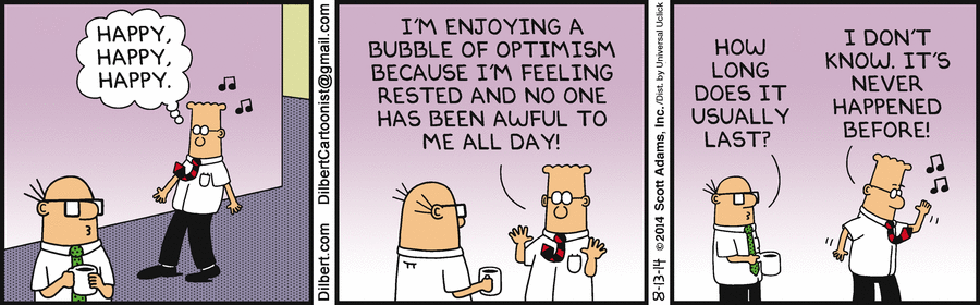 Dilbert: Happy, happy, happy. Dilbert: I'm enjoying a bubble of