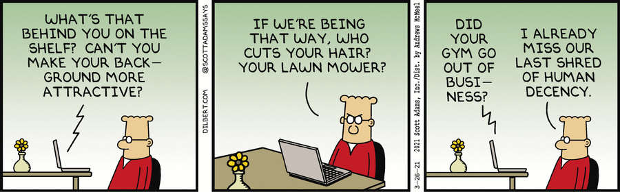 Dilbert on video call. voice from laptop: what's that behind you on