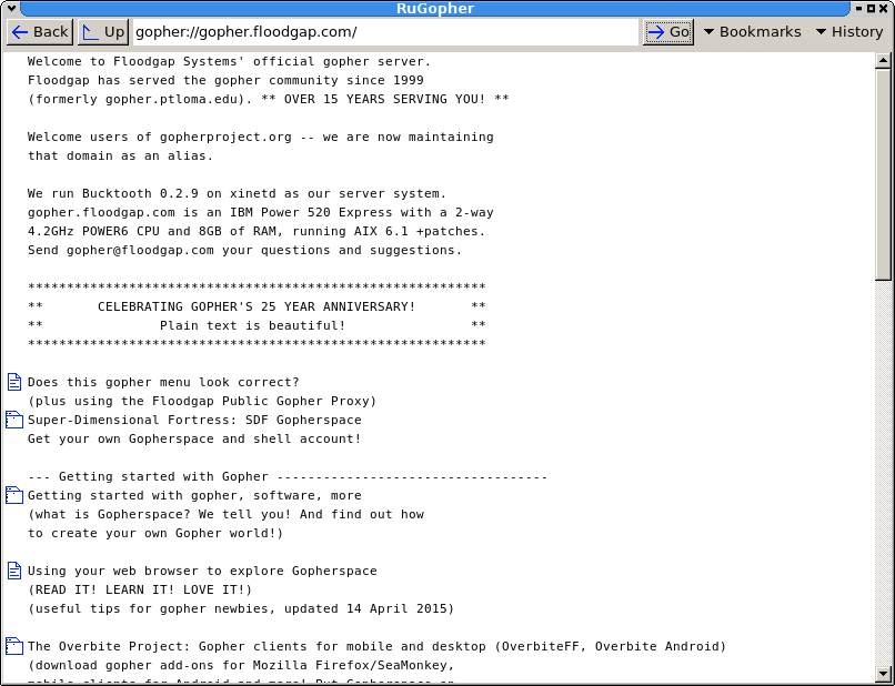 RuGopher is a Ruby and FXRuby-based Gopher client. Features: